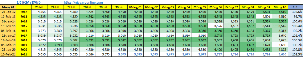 • Giá vàng sẽ không biến động nhiều từ 28 tết tới mùng 05 tết hằng năm (việc này có thể giải thích tương ứng với lịch nghỉ tết từ phía nhà nước)