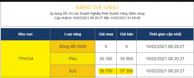 Chênh lệch giá vàng mua / bán = 57350/56750 ~ 101% hay là 1% phí chênh lệch mua bán
