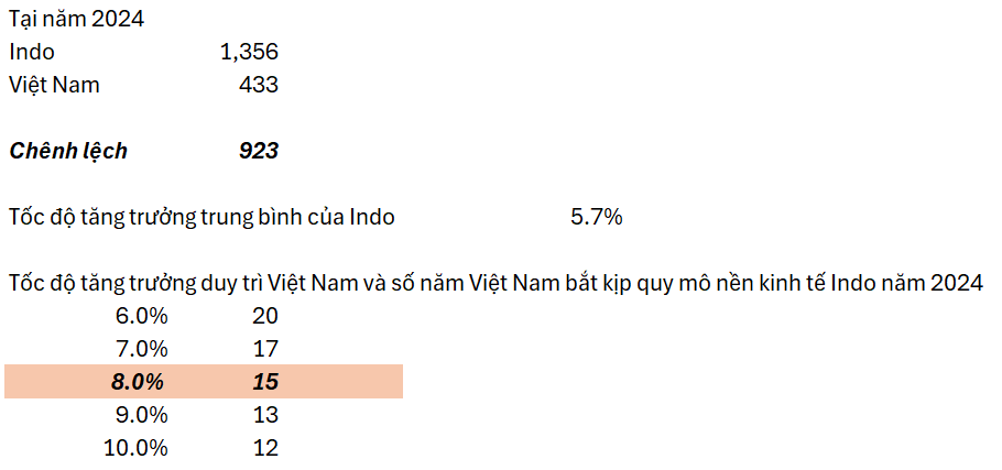 Làm thử một bài toán nhỏ về việc sau bao lâu Việt Nam sẽ đạt được quy mô nền kinh tế như Indo năm 2024